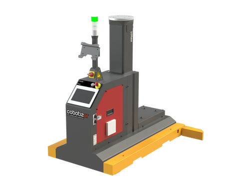 Kolaboratif (cobot) robotlar için geliştirilmiş paletleme platformu; ilave güvenlik kafesi ve özel güvenlik sensörlerine ihtiyaç duymadan paletleme sürecini sadeleştirir.